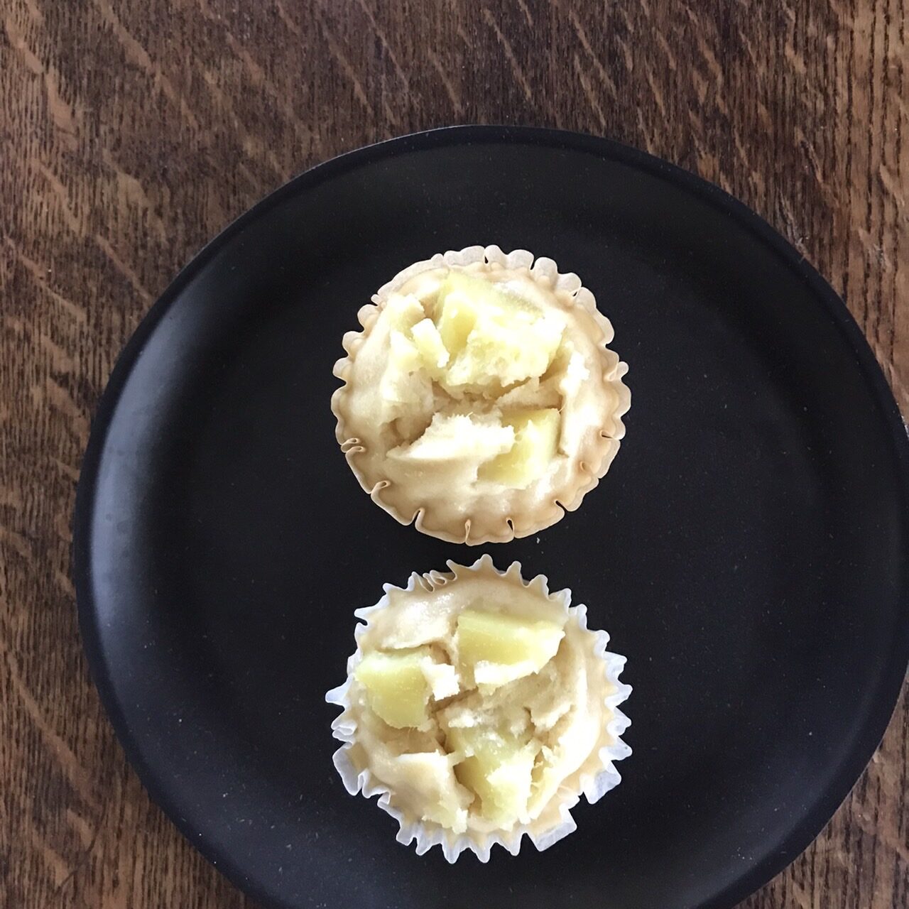 型に生地を流し入れ、軽く潰した1を真ん中に入れる。※型はプリンカップやココットにカップシートを入れて使う。