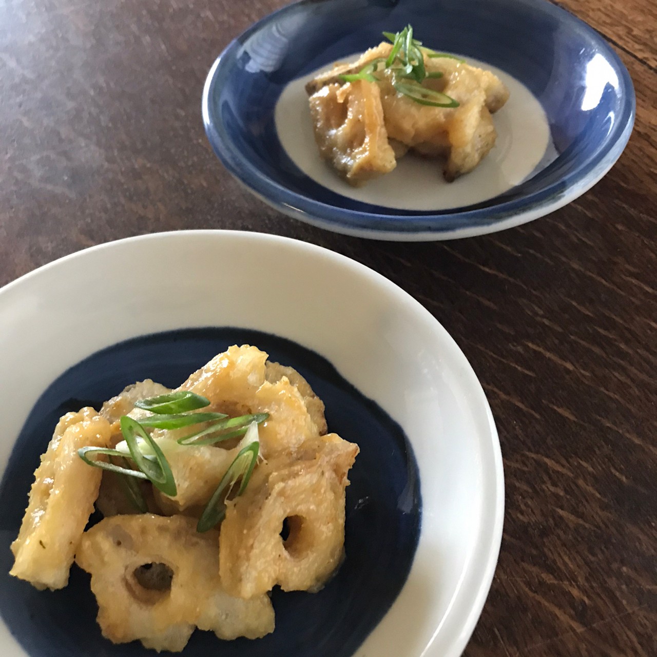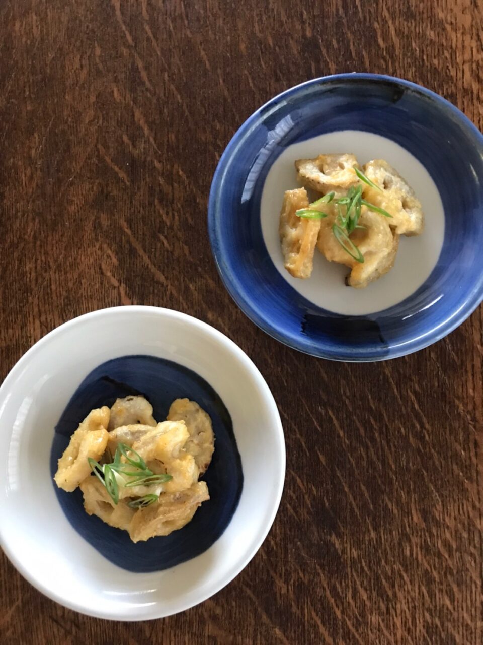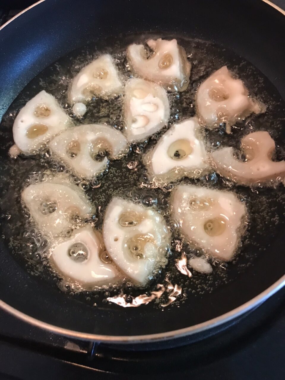 レンコンを一口大に切り、天ぷら衣をつけて揚げ焼きにする。