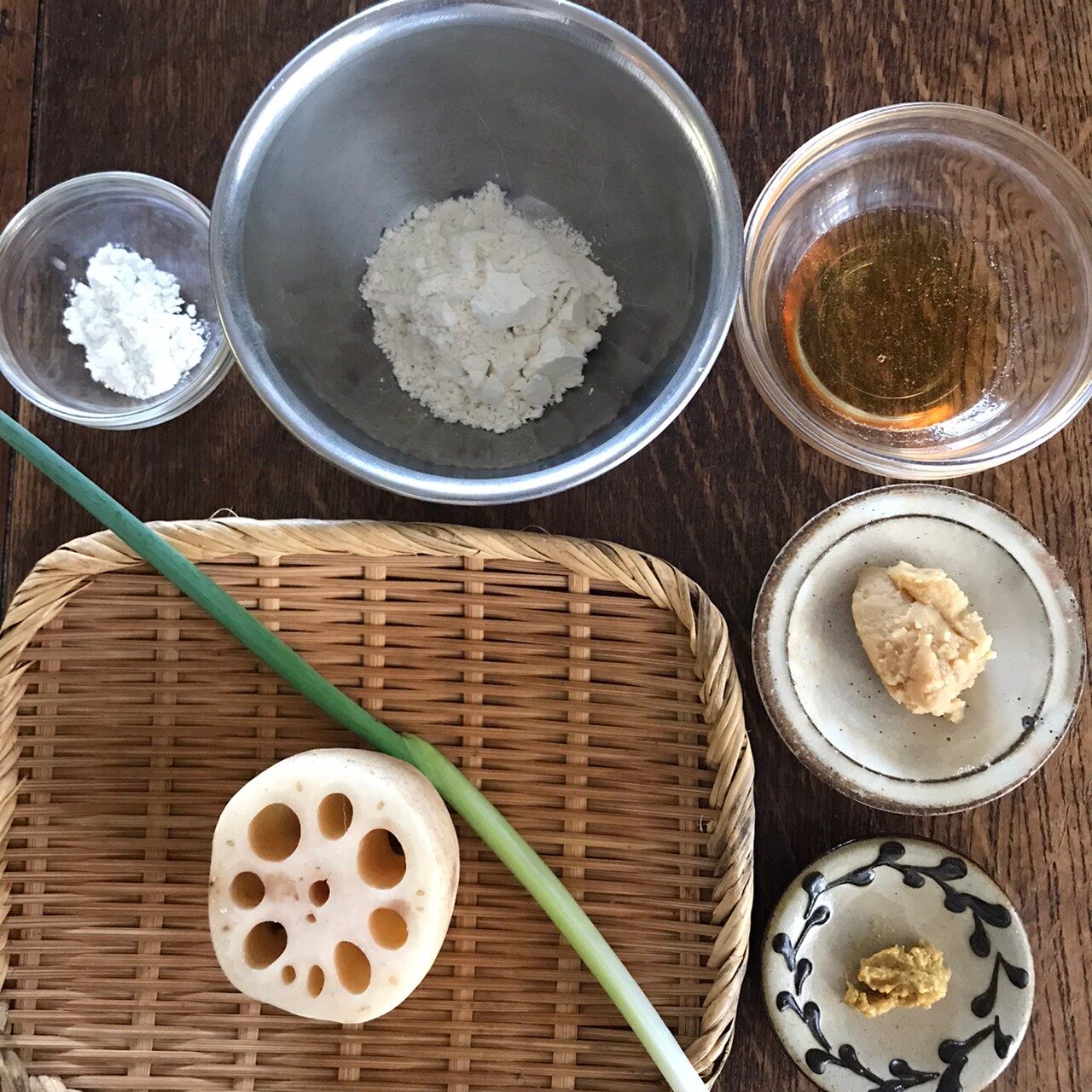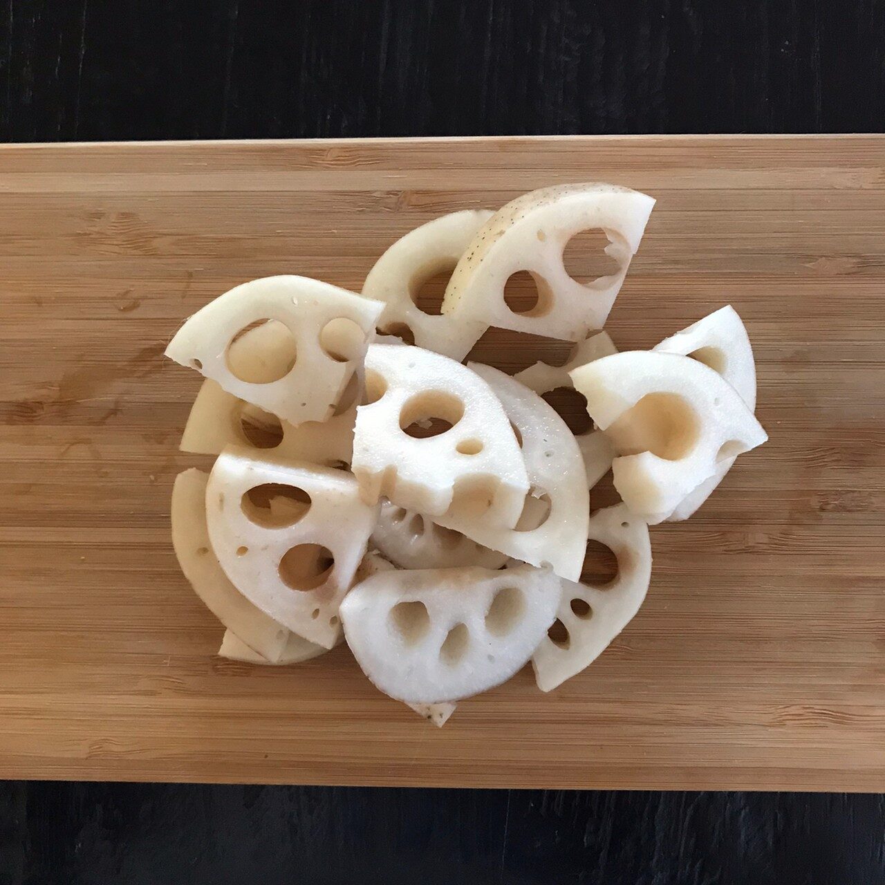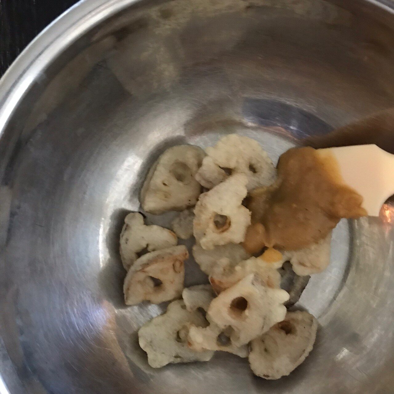 レンコンを一口大に切り、天ぷら衣をつけて揚げ焼きにする。