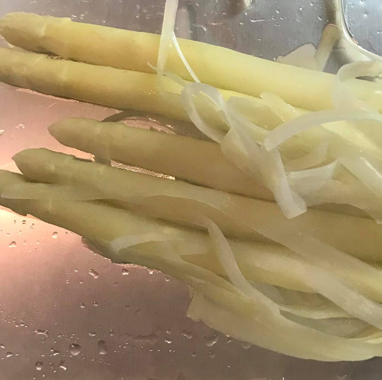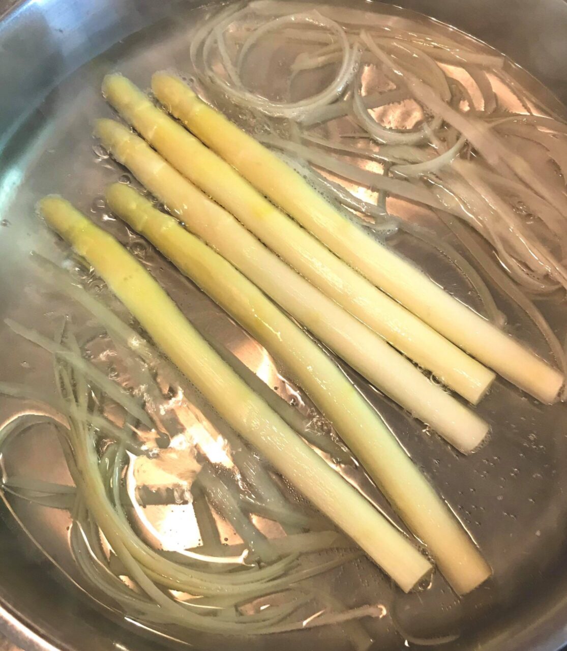 ピーラーで皮をむいたホワイトアスパラガスと皮を鍋に入れ、水からゆっくり柔らかくなるまで茹でて一旦取り出す。