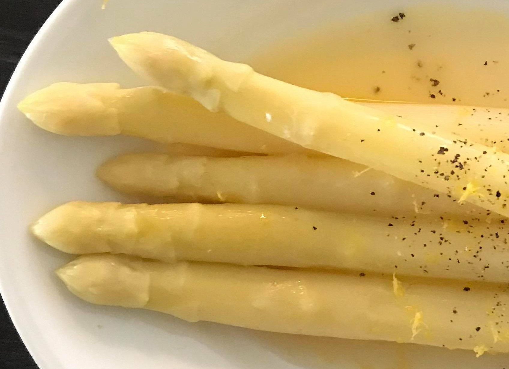 煮汁に白ワインを入れて煮詰め、濃いめのスープくらいに塩で味付けし、アスパラガスをもどして温める。好みで煮汁にバターを溶かす。 皿に盛り付けて黒コショウとレモンの皮を散らす。