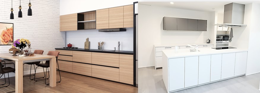 壁付型キッチンと対面式のペニンシュラ型キッチン。対面式ではダイニング側の仕上げも必要になります。